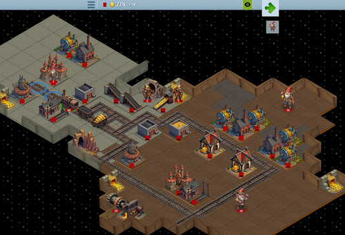The dwarven faction's core components are the locomotive and rail-laying machinery. Miners extract coal and gold from the mines, and the locomotive arrives with empty freight cars and transports the resources to a city. The city can then process the coal and gold into resources and electricity. Connecting electricity to the rails allows the train to run on the city's resources rather than its own coal reserves.
